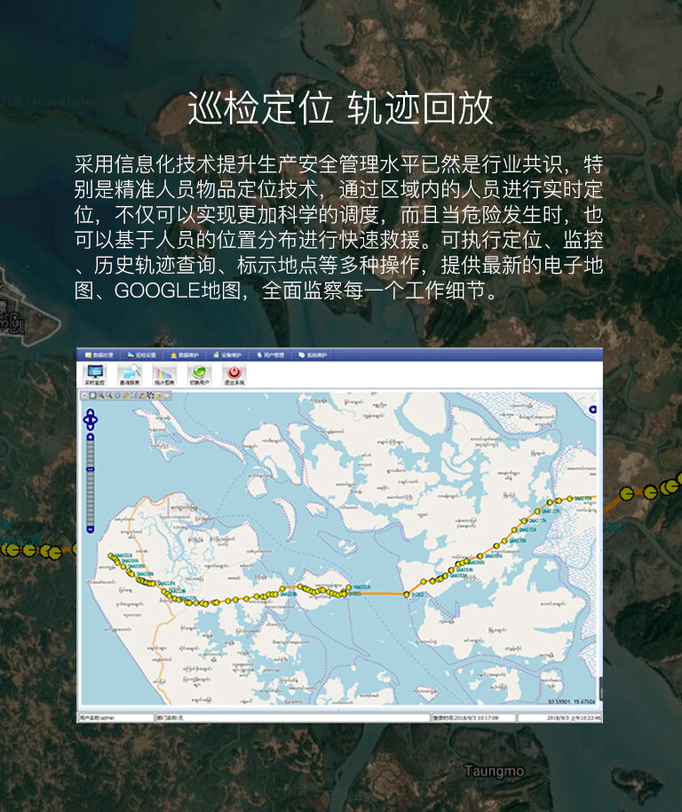 巡檢器通過北斗定位芯片、會對數(shù)據(jù)完成感知、存儲和傳輸,并在系統(tǒng)后臺軟件上實時顯示人員定向! 管理者通過PC端或移動客戶端輕松實現(xiàn)管理,并消除隱患,保障安全。 產(chǎn)品工業(yè)級防爆IP67,無漏檢、免布點、定位精度<5米,定位軌跡回放、4G網(wǎng)絡(luò)實時傳輸。 整合管理功能:人員定位、巡檢、考勤、軌跡回放、監(jiān)督管理等。